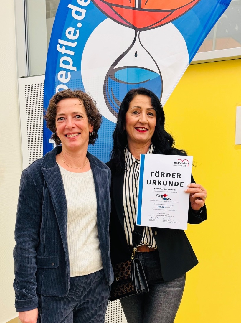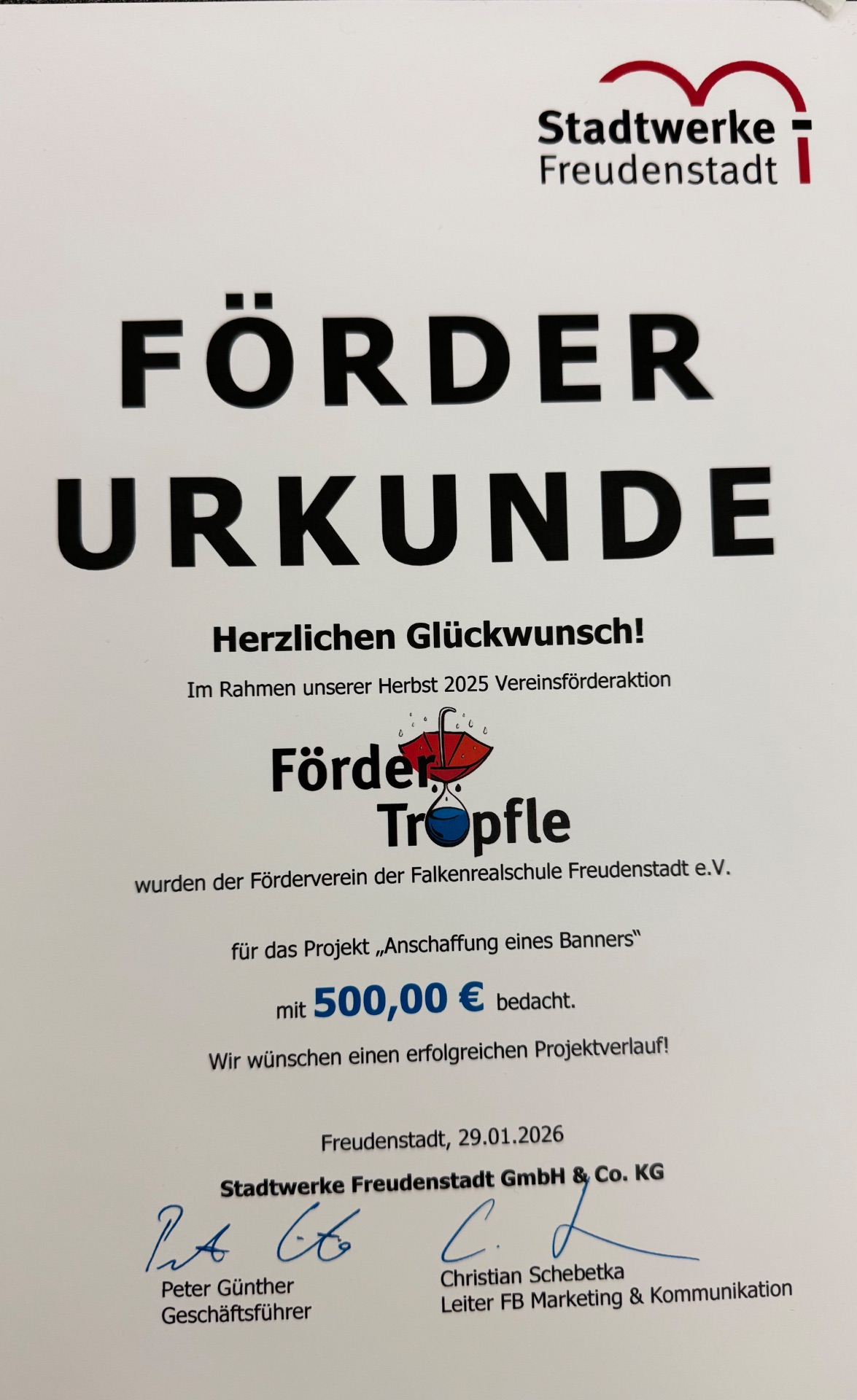 Ganz herzlichen Dank den Stadtwerken Freudenstadt, die den Förderverein mit 500 €uro im Rahmen des „Fördertröpfle-Programms“ unterstützen. Der Förderverein wird ein Werbebanner anschaffen. Frau Kohlbecker und Frau Pinjuh nahmen den Preis und die Urkunde in Empfang.